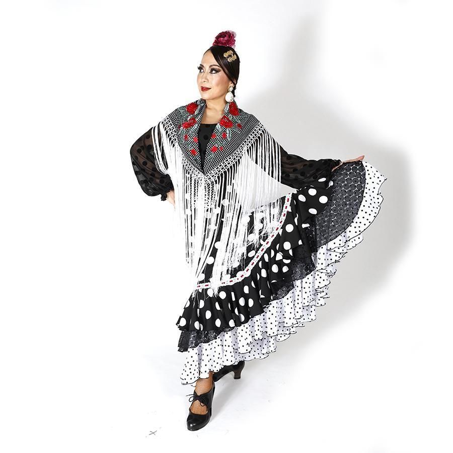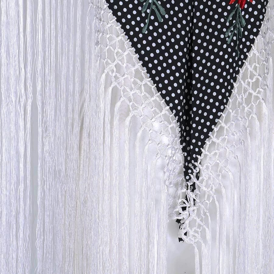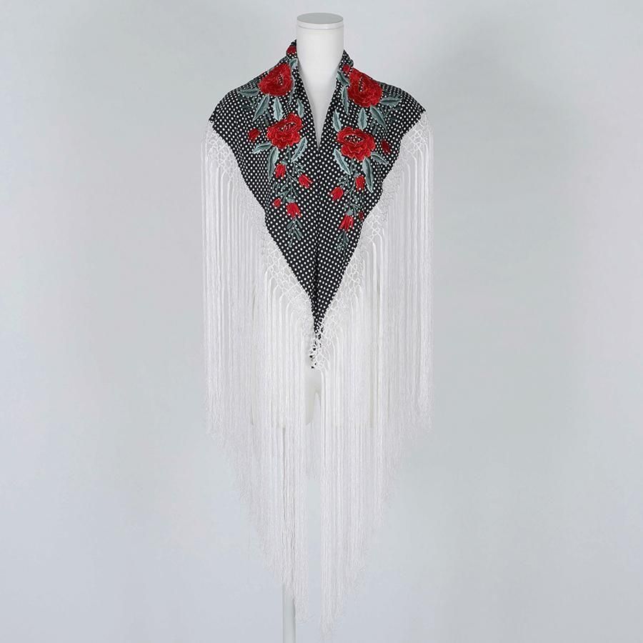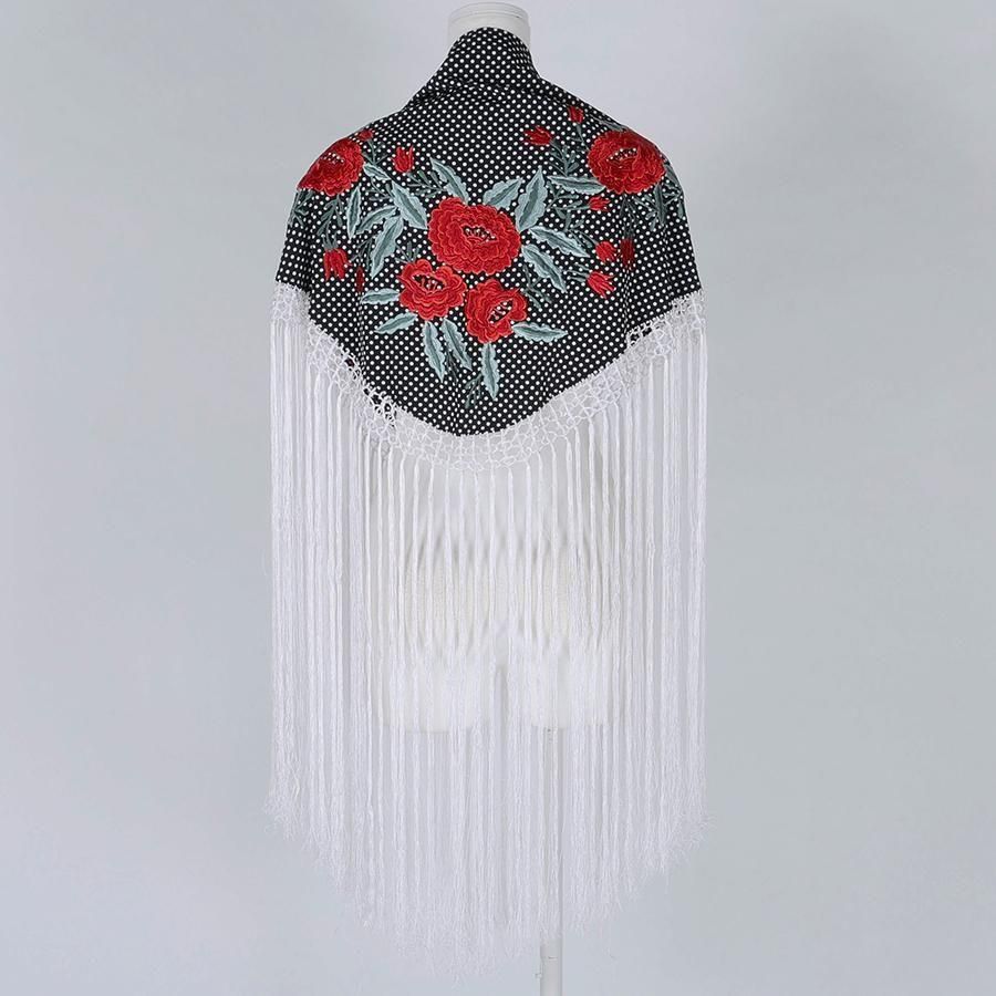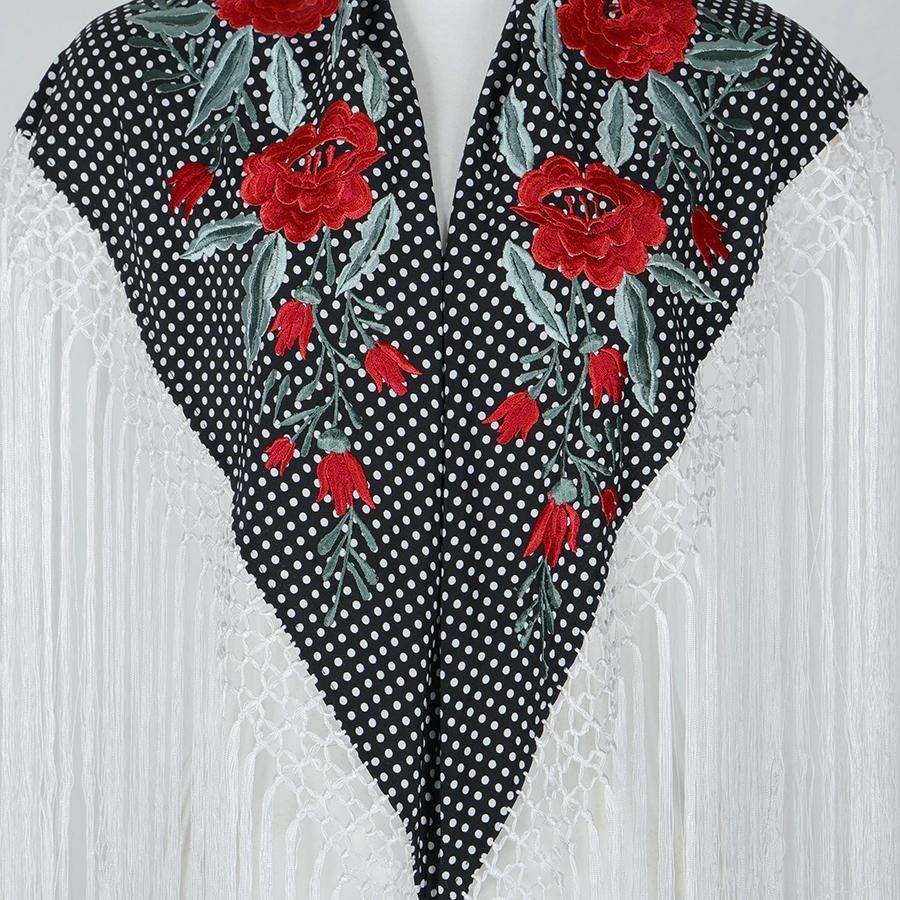 MAS033 刺繍ショール ブラック・ホワイト水玉多色刺繍/ホワイトフレコ<1点のみクリックポスト便にて配送>